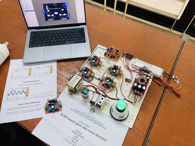 An electronics-based project fair happened and was organized by the Dept. of Electronics & Telecommunication Engineering - ETE, RUET as a part of the undergrad course ETE 2200 (19 series). There were almost 60 electronics-based projects from 2nd-year students of the ETE Department. Among these projects, five projects were considered in the top 5 lists: [According to roll no. sequence rather than rank basis] 1. IGBT-Based Pure Sine Wave Inverter - Sudipto Mondal - 1904009 2. Smart Poultry Farming - Omor Faruk - 1904040 3. Bluetooth Control LED Matrix Display - Md. Kawsar - 1904041 4. Line Follower Robot - Md Nirob Hossain - 1904047 5. IoT and GPS-GSM based Land Mine and Human Detection Robot with Automated Data Monitoring System - Md. Muhaiminul Islam - 1904059